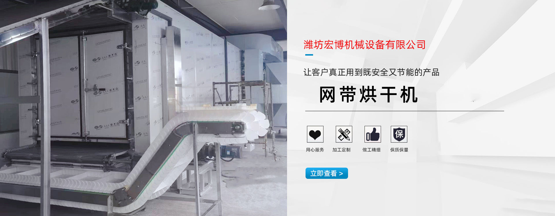 宏博公司主要产品有:网带烘干机、食品烘干机、滚筒烘干机、隧道窑、烘干箱、燃气热风炉、高大车间供暖设备、矿用防爆电加热器等。